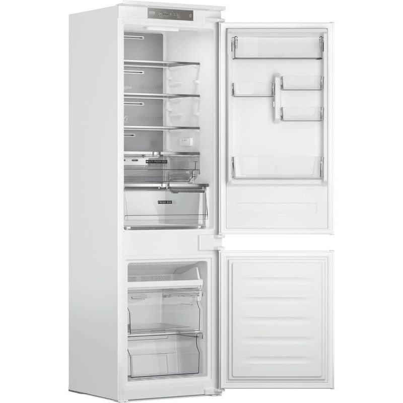 Cechy lodówko-zamrażarki do zabudowy Whirlpool: kolor biały. Szklane półki zapewniają wytrzymałość i elegancję. Wentylator zapewnia płynny i równomierny przepływ powietrza we wnętrzu urządzenia w celu zapewnienia udoskonalonej wentylacji. Czujniki 6-ty Zmysł automatycznie obniżają temperaturę w lodówce po włożeniu nowych produktów, zmniejszając zużycie energii. Praktyczna półka do bezpiecznego przechowywania butelek.
