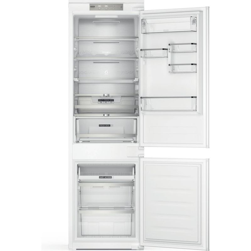 Cechy lodówki do zabudowy Whirlpool: kolor biały. Szklane półki zapewniają wytrzymałość i elegancję. Wentylator zapewnia płynny i równomierny przepływ powietrza we wnętrzu urządzenia w celu zapewnienia udoskonalonej wentylacji. Czujniki 6-ty Zmysł automatycznie obniżają temperaturę w lodówce po włożeniu nowych produktów, zmniejszając zużycie energii. Praktyczna półka do bezpiecznego przechowywania butelek.