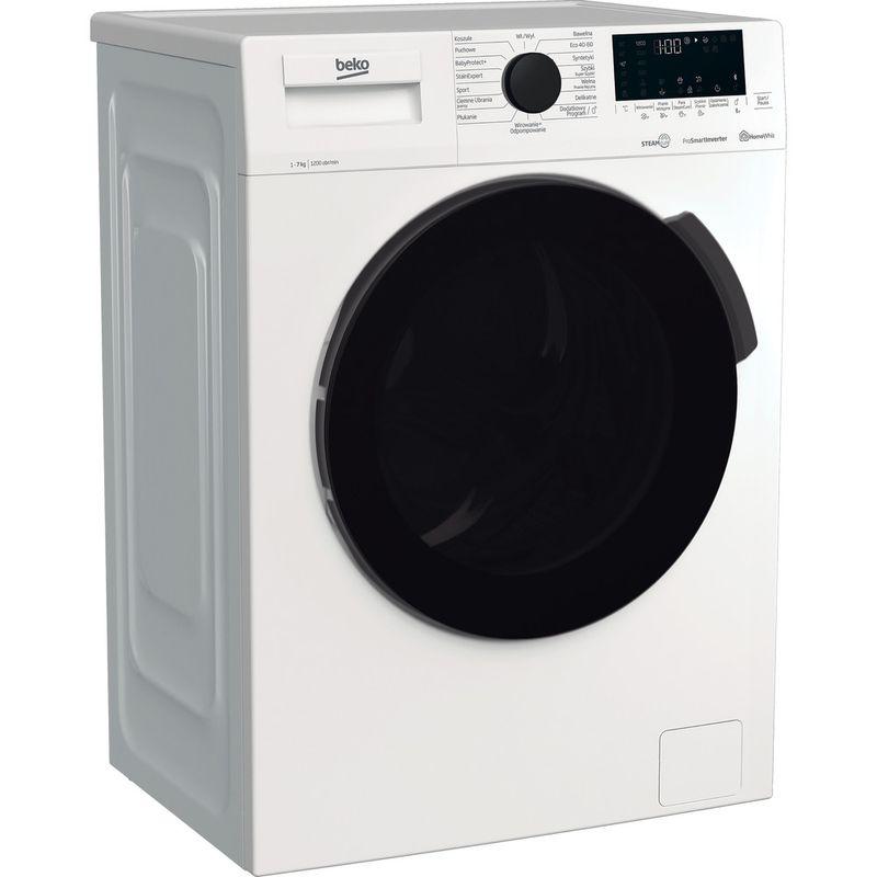 Cechy pralki Beko: Technologia Silnika Inwerterowego zapewniająca cichą i energooszczędną pracę, Dno ze stali nierdzewnej, technologia SteamCure usprawniająca usuwanie zabudzeń oraz późniejsze prasowanie tkanin, Aplikacja HomeWhiz dająca dostęp do dodatkowych funkcji pralki